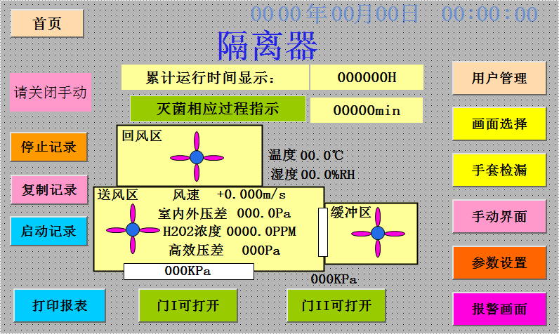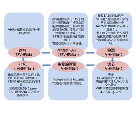 除湿——使隔离器内的空气循环通过除湿装置,将隔离器内的相对湿度降低下?使VHP灭菌效率提高:/p> 灭菌——输入过氧化氢蒸汽,并保持隔离器内预期的浓度,保持VHP浓度?00PPM以上,并保持灭菌时间30min以上:/p> 除残留——停止输入过氧化氢气体,将灭菌系统切换到除残留系统,使隔离器内的过氧化氢气体循环通过催化器进行分解,降低过氧化氢浓度?0PPM以下,然后通过通风以达到残留值不大于1ppm、/p> 检查工作状态——系统切换至洁净维持状态,按设定的工作风速和舱内的正压,自动变频调节送风量、回风量、新风量,保持舱内洁净度和正压状态,同时在线检测工作区洁净度,也可手动启动浮游菌采样、/p> |