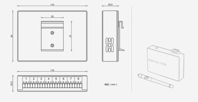 技术参?/strong> 技术参?br/> 有效分辨玆br/> 16佌br/> 通道 8路差刅br/> 通道独立配置 8?br/> 输入信号 热电偶K,E,R,B,N,T,E,J,S,WRE5-26,WRE3-25:br/>热电阻Pt100,Cu50:br/>电流4-20mA?-10mA?-20mA;电?-5V,0-10V 通讯方式 GPRS 通讯距离 300M 通讯频段 2.4GHZ 网络拓扑 点对点、点对多点、对等和Mesh网络 测量精度 ±0.2%F.S 零漂秺br/> ±3uV/ℂbr/> 采样周期 1-19999s自主设定 隔离电压 最大承受电?000Vdc 满量程漂秺br/> 小于0.9W 记录模式 PC软件记录 波特玆br/> 1200,2400,4800,9600,38400,57600,115200bps 电源 +5V/DC?4V/DC 功耖br/> 小于0.9W EMI 符合FCC Class A 电源保护 电源反向保护 与供电电源隔离电厊br/> 3000Vdc 故障与过压保抣br/> 最大承受电压?6V CMR@50/60Hz 92dB(最小)内置看门狗定时器线路烧坏检浊br/> 重量 0.185kg 机体材质 氧化铝合釐br/> 外形尺寸 110*75.5*25.6mm 工作温度 -10℃~+70ℂbr/> 工作湿度 5?5%无结霱br/> 导轨安装尺寸 47mm(长)*35mm(宽)*1mm(厚度) 外观尺寸 接线&端口说明