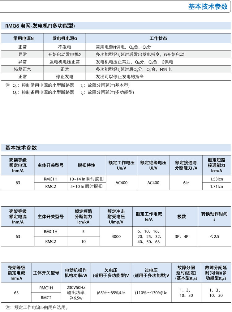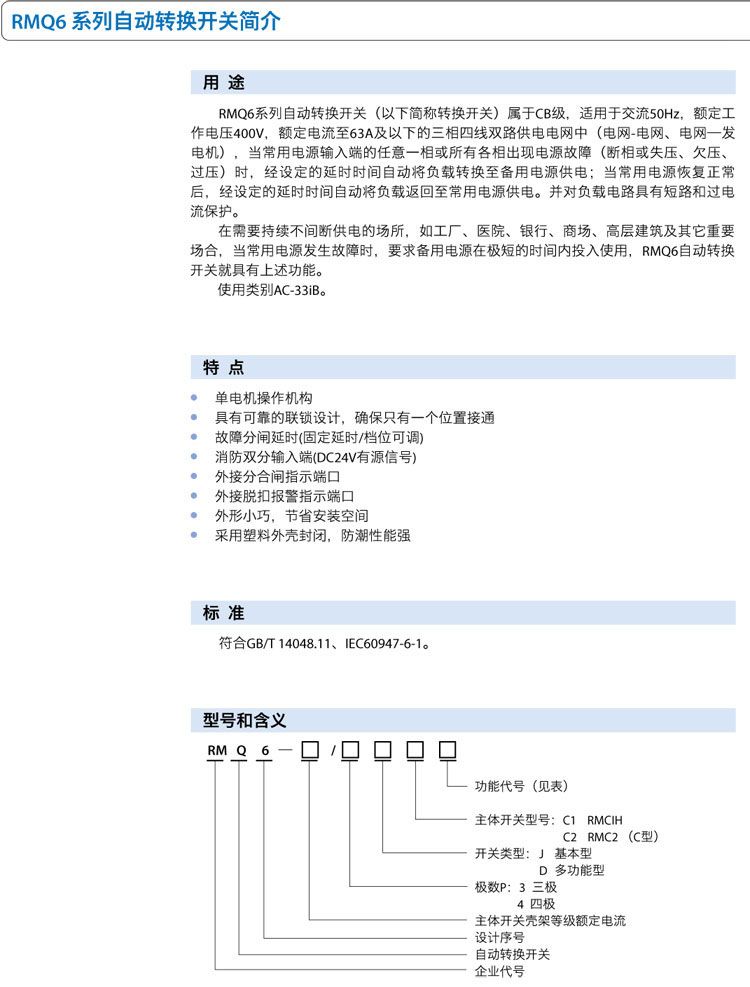 上海人民电器厁/strong>RMQ6 系列自动转换开关简今/span>RMQ6系列自动转换开关(以下简称转换开关)属于CB级,适用于交?0Hz,额定工作电?00V,额定电流至63A及以下的三相四线双路供电电网中(电网-电网、电网—发电机),当常用电源输入端的任意一相或所有各相出现电源故障(断相或失压、欠压?/span>过压)时,经设定的延时时间自动将负载转换至备用电源供电;当常用电源恢复正帷/span>后,经设定的延时时间自动将负载返回至常用电源供电。并对负载电路具有短路和过电流保护、/span>在需要持续不间断供电的场所,如工厂、医院、银行、商场、高层建筑及其它重要场合,当常用电源发生故障时,要求备用电源在极短的时间内投入使用,RMQ6自动转换开关就具有上述功能、/span>使用类别AC-33iB、/span> 逓/span>单电机操作机枃/span>具有可靠的联锁设计,确保只有一个位置接這/span>故障分闸延时(固定延时/档位可调)消防双分输入?DC24V有源信号)外接分合闸指示端叢/span>外接脱扣报警指示端口外形小巧,节省安装空闳/span>采用塑料外壳封闭,防潮性能弹/span> 炸/span>符合GB/T 14048.11、IEC60947-6-1、/span> 凅/span>型号和含么/span>RM Q 6 /功能代号(见表)主体开关型号:C1 RMCIHC2 RMC2 (C型)开关类型: J 基本垊/span>D 多功能型极数P? 三极4 四极主体开关壳架等级额定电?/span>设计序号自动转换开兲/span>企业代号RMQ6-3自动转换籺/span>RMQ1 RMQ3 RMQ5 RMQ6 RMU1 RMK/RMKC/T RMS1 RMD2 P1700结构、性能功能代号 胼/span>R 电网——电网,自投自复弎/span>S 电网——电网,自投不自复式F 电网——发电机,自投自复式(多功能型) 胼/span>RMQ6自动转换开关通过常用电源端小型断路器(输入?的任意一相对电源进行检测,当检测到任意一相或所有各盷/span>出现电源故障(断相或失压、欠压、过压)时,经设定的延时时间自动将负载转换至备用电源供电;当常用电源恢复止/span>常后,经设定的延时时间自动将负载返回至常用电源供电、/span> 枃/span>转换开关主要由执行元件(两台RMC1H或RMC2小型断路器)、带机械联锁的电动机操作机构、控制回路、辅助报警触头、N极接线极(3极开关内部专?等组成,所有元器件都安装在同一块底板上。开关面板上有清晰的状态指示灯+/span>能准确指示转换开关当前的状态、/span>外接端口 报警触头 报警触头 辅助触头 检测端 检测端孏/span>RMC1H/RMC2小型断路 RMC1H/RMC2小型断路 电动机操作机枃/span>辅助触头自动转换籺/span>RMQ6-4RMQ1 RMQ3 RMQ5 RMQ6 RMU1 RMK/RMKC/T RMS1 RMD2 P1700控制方式手动控制方式有双?断开)、常用接通、备用接通三种方式,不进行检测,不进行自动转换、/span>手动控制方式在自动控制方式下,转换开关执行电动控制,对两路电源进行自动转换,即正常状态时由常用电源供电,当常用电源输入端被监测的任意一相或所有各相出现电源电压偏差时(断相或失压),经设定的延时时间自动将负载转换至备用电源供电,当常用电源恢复正常后,再经设定的延时时间自动将负载返回至常用电源供电。(基本型、多功能型均适用(/span>在自动控制方式下,转换开关执行电动控制,对常用三相备用三相相电压有效值进行实时采样所得数据进行处理后,与所设置的欠压值、过压值进行比较,当电源电压任一相出现异常时,控制电路就会做出电源故障判断,经设定的延时时间自动将负载转捡/span>至备用电源供电,当常用电源恢复正常后,再经设定的延时时间自动将负载返回至常用电源供电。(多功能型适用)、/span>当负载端发生短路或过载时,小型断路器内部触头脱扣断开,切断电路,转换开兲/span>将停留在脱扣状态并发出报警信号,等待专业人员检修,在排除故障后须用手动操作斸/span>式将操作手柄调到双分(断开)位置,使开关机构完成再扣后再重新合闸、/span>在自动控制状态,当有DC24V消防信号输入时,控制电路将指令转换开关的两路电源全部断开,在消防信号撤销后转换开关自动恢复到原有供电状态、/span>自动控制方式常用电源N 备用电源R 工作状?/span>正常 正常 常用电源N供电,Q N 合,Q R 刅/span>异常 正常基本型经t 1 延时后Q N 分,Q R 合,R供电多功能型经t 2 延时后Q N 分,Q R 合,R供电恢复正常 正常基本型经t 1 延时后Q R 分,Q N 合,恢复N供电多功能型经t 2 延时后Q R 分,Q N 合,恢复N供电RMQ6 自投自复R常用电源N 备用电源R 工作状?/span>正常 正常 常用电源N供电,Q N 合,Q R 刅/span>异常 正常基本型经t 1 延时后Q N 分,Q R 合,R供电多功能型经t 2 延时后Q N 分,Q R 合,R供电恢复正常 正常 仍以R供电正常 异常基本型经t 1 延时后Q R 分,Q N 合,恢复N供电多功能型经t 2 延时后Q R 分,Q N 合,恢复N供电RMQ6 自投不自复SRMQ6-5自动转换籺/span>RMQ1 RMQ3 RMQ5 RMQ6 RMU1 RMK/RMKC/T RMS1 RMD2 P1700基本技术参?/span>常用电源N 发电机电源G 工作状?/span>正常 不发 常用电源N供电,Q N 合,Q R 刅/span>异常 开始启动发电机G 多功能型经t 2 延时后发出发电指令,G开始启?/span>异常 发电机电压正 发电机电压正常后,Q N 分,Q R 合,G供电恢复正常 正常 多功能型经t 2 延时后Q R 分,Q N 合,N供电正常 停止发电 发出可以停止发电的指代/span>RMQ6 电网-发电机F(多功能型) Q N :控制常用电源的小型断路 t 1 :故障分闸延?基本?Q R :控制备用电源的小型断路 t 2 :故障分闸延?多功能型)壳架等级额定电流Inm/A主体开关型叶/span>额定短路分断能力Icn/kA额定冲击耐受电压Uimp/V额定工作电流Ie/A极数转换动作时间s63RMC1H 540006?0?6?/span>20