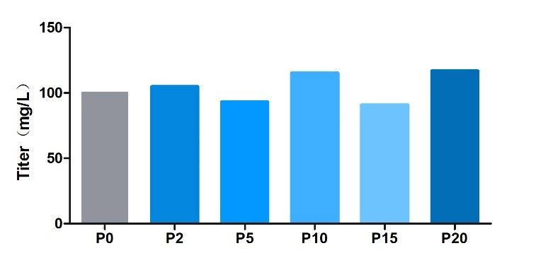 HEK293 F细胞在Wayne293?中连续传代的生长及瞬转表达情况?25mL摇瓶,工作体?0mL,?5mm?25rpm,湿?5%?%CO237℃培养;隔天传代,共传代20次,?代冻存;传代结束后统一复苏,按说明书标准方法转染同一个IgG质粒,检测瞬转表达量 高产量表达: