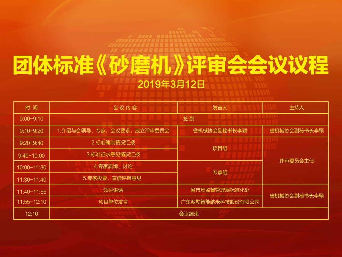2019??2?:00—?2:00,省机械行业协会团体标准《砂磨机》评审会在广东派勒智能纳米科技股份有限公司三楼会议室隆重举行、/p>