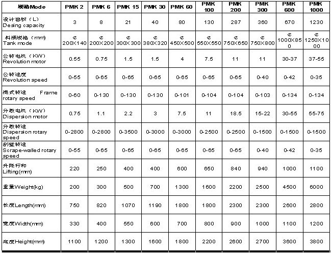 PMK 行星混合捏合机通过行星系统驱动两个旋转的十字形搅拌器交叠布置,实现高效,柔和的产品混合。高速分散元件结合以低速十字形搅拌元件通过行星运行、搅拌桨相互间以及搅拌桨与物料桶内壁的精密间隔,使得死角极小,实现高能量输入,具有强大的剪切力及高度的捏和效果,达到高效混合-捏合效果、br/>派勒TMPMK 友/span>行星动力混合捏合朹/strong>是一种集反应、混合、混炼、分散为一体的高效、多用途设备。适用于各行业的液-液、固-液、膏体-膏体、粉-膏物料密度、比例悬殊、从低黏度到高黏度(150万Cps)的生产工艺中、/p> 备性能特点: 1.机械密封和釜体之间的(梯形)软密封,使物料可在真空下操作:/p> 2.釜体可电、蒸气、水及油循环加热。传动轴上的独特温度探测装置确保物料温度误差小于±1℃,夹套、底部夹套及夹套内盘管、导流板可实现冷却; 3.釜体内壁为大型立车精加工,再经大型抛光机自动抛光,确保行星架上的活动刮刀(适用于密封胶)在旋转时,把釜体内壁上的物料完全刮掉; 4.釜内麻花框式搅拌桨(桨与桨、桨与桶壁间?-4mm),在公转的同时也自转,使物料上下及四周流动,从而可在很短时间内达到混合(混炼)效果.釜内另外一个或两个高数分散器,在公转的同时高速自转,使各种物料受到强列的剪切与分散混合,效果是普通混合机的几倍; 5.釜内的搅拌桨与高速分散器的公转、自转均采用变频调速(变频电机),可根据不同工艺、不同粘度选择不同转速。测速系统直接给出不同的搅拌桨当时的转速、/p> 各种着色材料,磁性涂布材料,陶瓷,电子部件材料,粘接材料,锡膏,磷酸铁锂电池,密封材料,隔热材料(BMC,CMC 等)工程塑料,氯乙烯粘性体,各种金属粘性体,化妆品,医药产品,有机染料增光,印刷油墨增光,天然糖胶树脂(口香糖原料),复印用染料粉,水溶型和溶剂型材料的增光及粉状化、/span> 派勒PMK友/span>行星动力混合捏合朹/span> 一?nbsp; 能源9/span> 各种电池浆料、膏料(锂电池、镍铬电池、镍氢电池、燃料电池、动力电池、钮扣电池等( 二?nbsp; 电子电器9/span> 电子电极浆料、陶瓷浆料、磁性材料、硅胶油墨、电子涂料、电子胶粘剂、电子电器件灌封 胶、PVC 塑胶、热熔胶、各种浆佒 三?nbsp; 化学品: 各种密封胶、胶粘剂(硅酮密封胶、聚硫密封胶、聚氨脂密封胶、中空玻璃密封胶、防水密 封胶、结构密封胶、厌氧胶、石材胶、模具胶等)、合成树脂橡胶、硅油、颜料、涂料、油 墨、腻子、研磨剂(膏)、润滑膏、蜡制品、合成橡胶、合成树脂、各种粉体物料、陶瓷颜 斘 四?nbsp; 医药品: 各种软药膏、高分子凝胶(医用贴、小儿退热贴、感冒快贴、冰贴、眼贴)、胶囊、糖浆?/span> 牙齿? 五?nbsp; 化妆品、日化品9/span> 润肤霜、口红、乳液、凝胶、面膜、睫毛膏、粉底、指甲油、牙膏、香皂、洗发液. 技术参数: |