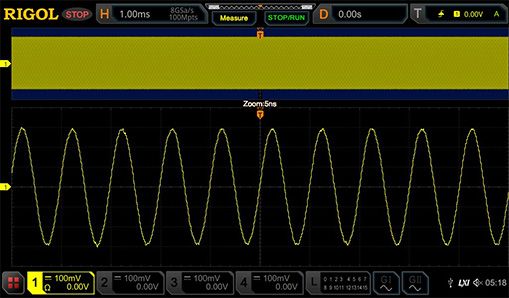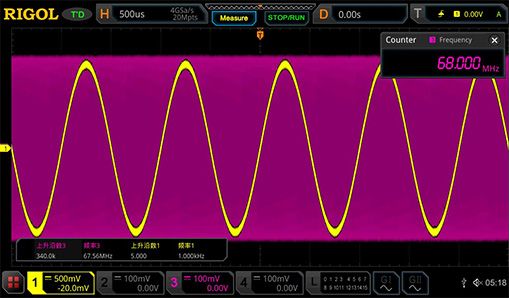 全内存硬件测野/strong> 同时观察并准确测量两路频率相差很大的信号,全内存硬件测量可以在具?40k个上升沿的波形中测得准确的频率值、/p> |