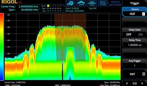 通过FMT模板进行信号触发及监浊/strong> FMT频率模板触发是实时频谱分析仪才独有的触发模式。您可以快速构建模板,并对符合模板规则的信号进行准确的定位及触发,从而发现监测范围内偶发的异常信号、/p> |