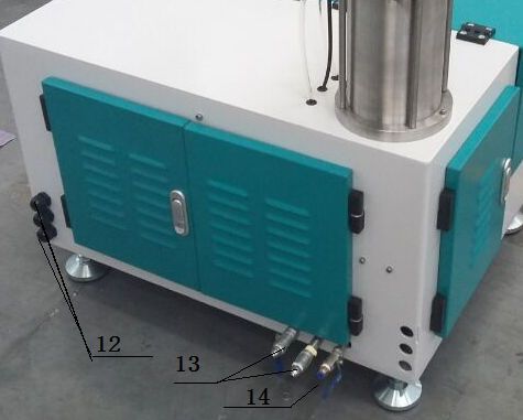 8、压力变送器:输出进料压力信号,可设置进料压力保护; 9、冷却罐:br/>10、液位开 设置液位高度,低于设定液位时设备无法工作:br/>11、压力表:显示冷却罐压力:br/>12、电缆线接头:设备主体和电控柜走线位置; 13、冷却水进水口和回水口; 14、进气口、/span> |