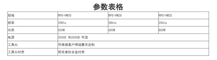 超声波铆焊简今/strong> 超声波铆接适用于将热塑性塑料接合,在一起或与非塑料接合招声波媒接和超声波铆接的主要区别在干,铆接时发生熔化变形,两人连接部分中只有一个被想化。这使得连接任何彼此不兼容或与非塑料不兼容的热塑性塑料成为可能。结果,铆接接头几乎没有间隙,因为冷铆工具允许熔融铆钉头在压力下冷些、/p> 虽然超声波铆接的循环时间比表面焊接的循环时间长,但使用一个超声波焊头可以同时执行多个铆接操作。与超声波焊接样,超声波铆接也非常高效,同时还节省能溏/p> 该技术主要用于不可能进行熔焊、金属部件要插入塑料外壳或随后看不到连接的地方。RPS-SONIC 设计和制造用于铆接内饰、保险杠或安全气部件的标准和特殊机器,尤其适用于汽车行业。超声波铆接也成功地用于制造各类外壳、家居用品、电子消费品和玩具、/p> 超声波手持式铆焊优点 便携,体积小,适用场景多; 焊接力度灵活,焊接牢固度高; 超声波电箱自动追频,使用稳定性高:/p> 无噪音污染,无助焊剂污染,环保安全、/p> 产品参数