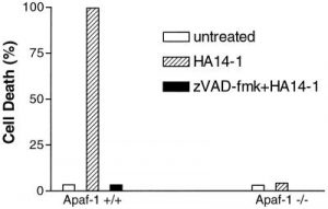 Effect of HA14-1 on Apaf-1? and Apaf-1+/+ cells. Apaf-1-deficient mouse embryonic fibroblast (Apaf-1?? and NIH 3T3 (Apaf-1+/+) cells were treated with 50 μM HA14-1 for 24 h. Percent cell death was determined by using Trypan blue staining. To examine the role of caspases in the death of Apaf-1+/+ cells induced by HA14-1, cells were preincubated with zVAD-fmk for 2 h before the treatment of the compound. |