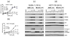 MI-773 potently inhibits cell growth in cancer cell lines, including SJSA-1 (IC50, 0.092 μM), RS4;11 (IC50, 0.089 μM), LNCaP (IC50, 0.27 μM), and HCT-116 (IC50, 0.20 μM) cells, and displays high selectivity over cancer cell lines with mutated or deleted p53, including SAOS-2 (IC50,>10 μM), PC-3 (IC50,>10 μM), SW620 (IC50,>10 μM), and HCT-116 (p53-/-) (IC50,>20 μM) cells |