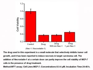 Necrostatin-1 (1-100 μM) inhibits the autophosphorylation of overexpressed and endogenous RIP1.It is found RIP1 is the primary cellular target responsible for the antinecroptosis activity of Necrostatin-1. Necrostatin-1 efficiently suppresses necroptotic cell death triggered by an array of stimuli in a variety of cell types. |