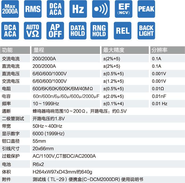 最大可测量AC2000A(真有效值),并搭载了万用表功能