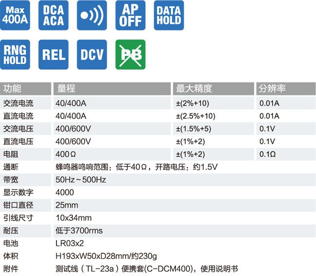 最大可测量交直流电?00A , 最高分辨率0.01A