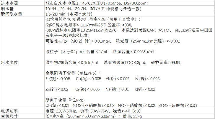 适用范围 适用于HPLC、TOC、PCR、AAS ICP、气相色谱氨基酸分析等、/span> 产品特点 1.微电脑全自动控制设计,LCD大屏幕彩色中文液晶屏显示,菜单式运行模式,设备运行状态一目了然,人机对话功能完备:/span> 2.电容式钢化玻璃触摸屏按键设计,高灵敏度,经久耐用,无按键损坏的忧虑,彰显美观与大气; 3.系统配备原水减压系统,杜绝了原水压力过高而引发漏水的事故:/span> 4.配备漏水检测报警保护装置,有效的防止因设备漏水导致的事故,更好地保护实验室的安全; 5.系统同时产出三种水质,分别为饮用纯净水、RO纯水和UP超纯水; 6.系统采用独有的双膜法工艺设计,配备反渗透压力监测表,可随时通过压力判断反渗透膜的运行压力及污堵程度,保证系统耗材的寿命更长; 7.系统具备开机自检、开机自动冲洗、缺水停机保护、停电自动复位、满水自动停机、超低压保护等功能; 8.系统具备UP超纯水电阻率(电阻率仪电阻池常?.01cm-1,温度灵敏度±0.1℃,温度自动补偿)、总有机碳?TOC)在线检测显示功能; 9.系统具备超纯水取水不达标循环功能,保持系统的低细菌污染要求,循环功能可以自由开启和关闭,循环上限值可以自由设定; 10.系统具备UP超纯水超标排放设定功能、耗材失效真人语音报警及更换提示功?耗材失效上限值可根据客户要求设定)、故障自动检测,提供安全保障:/span> 11.系统内置真空压力储水桶,避免了与空气接触的二次污染,更节约安装空间; 12.采用内置20英寸大容量一体式双通道注塑型预处理+纯化柱系?管路及接头均获NSF认证),RO膜组件采用美国陶氏DOW原装进口膜片,使用寿命更长; 13.预处理、RO膜、超纯化柱组件均采用快装插拔式模块化独立结构设计,使得系统维护、耗材更换更快捷方便,符合GLP规范:/span> 14.系统具备0-9999ml定时定量取水功能:/span> 15.系统具备历史数据储存查询功能,能有效准确地记录并查询历次取水时间(?????、取水量(ml) 及取水水质等历史数据:/span> 16.系统具备定时开/关机功能,用户可任意设定开机或关机时间,同时具有当前日期显示与时钟显示及设定功能; 17.系统具备二级PIN密码保护,可设置开机密码及用户操作密码,设备管理权和使用权分开,防止无关人员操作、/span> 18.可配置UV双波?85nm?54nm的紫外消解系?进口灯管),有效杀菌,降低TOC,增强系统适用范围(微量有机型标?:/span> 19.可配置进?.22μm进口PE聚醚砜复合滤膜终端除菌过滤器,保证水?微量有机型标?:/span>