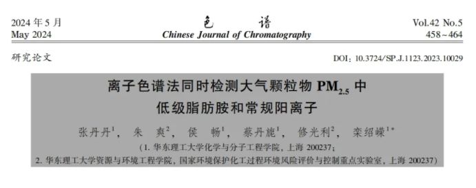 近日,华东理工大学栾绍嵘老师及所在团队在色谱期刊发布了题为“离子色谱法同时检测大气颗粒物PM2.5中低级脂肪胺和常规阳离子”的研究论文。该研究采用盛瀚SH-CC-9色谱柱,建立了一种新的离子色谱检测方法,实现了大气脂肪胺中MA、DMA、TMA、EA 4种短链脂肪胺?种常见阳离子的同步分析,对研究大气脂肪胺的组成和来源、评估大气污染状况、监测环境空气质量和保护人类健康具有重要意义、/p>