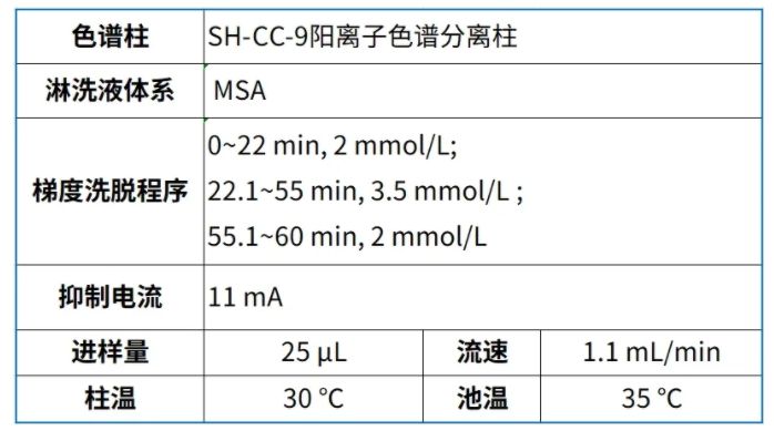 SH-CC-9是一种弱酸型阳离子色谱柱,其基质为交联度55%的苯乙烯-二乙烯苯聚合?表面接枝羧基,可用非抑制或抑制电导法完成常规阳离子分析,该分离柱可以在较低的淋洗液浓度下一次进样实 PM2.5中钠、铵、钾、镁、钙等常规阳离子以及甲胺、二甲胺、三甲胺和乙胺等脂肪胺的分离,峰形良好,分离度满足要求、/p>