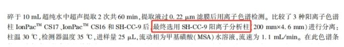 与IonPacTMCS17、IonPacTMCS16色谱柱实验对比,最终选用盛 SH-CC-9 阳离子色谱柱 标准储备液的配制 分别称取4种有机胺标准?0 mg?0 mL离心管中,加入超纯水溶解并定容?0 mL,配制?00 mg/L的有机胺混合标准储备液。有机胺混合标准储备液和阳离子标准溶液放置于4 ℃药品阴凉柜中避光保存。使用时用超纯水稀?配制成所需浓度的系列混合标准溶液、/p> 样品采集及预处理 PM2.5使用TH-100中流量采样器和直?0 mm的石英滤?根据环境空气颗粒物采集相关标准HJ 799-2016、HJ 800-2016、HJ 93-2013要求采集,采样器流速设置为100 L/min,采样时间?4 h。文献中,在此条件?采样效率大于99.7%,符合PM2.5采集滤膜截留效率要求。本实验按照此程序进行实际采样过程中,没有穿透现象发生、/p> 取采集样品后的滤?/2,剪碎,置于50 mL离心管中,加入10 mL超纯?为避免有机胺的挥?采用冰水浴超?操作2?每次30 min。吸取样品溶??.22 μm的水相滤?滤液转移?.5 mL样品瓶进行离子色谱分析、/p> 大气PM2.5中阳离子和有机胺含量计算 根据采样器的采样流速和采样时间、采集滤膜的提取体积、离子色谱检测得到的各离子的浓度,采用公式(1)计算大气PM2.5中阳离子和有机胺的含量、/p>