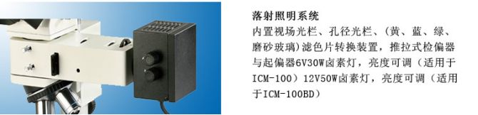 | 落射照明系统 | ICM-100 | 6V30W卤素灯,亮度可调 |