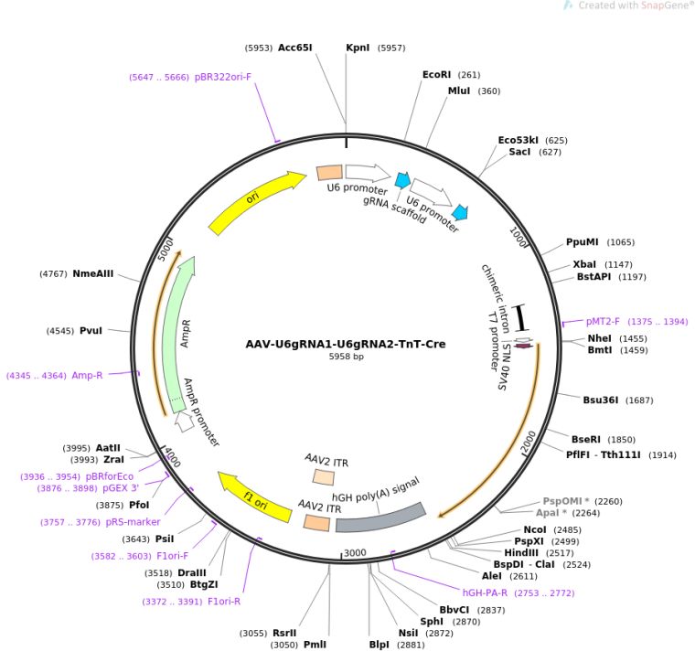 AAV vector for U6 driven expression of two gRNAs, and cardiomyocyte specific expression of Cre recombinase.