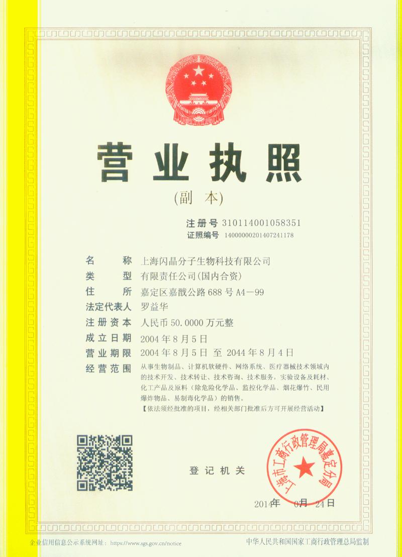 上海闪晶分子生物科技有限公司是以中科院生化所、细胞所、二医大的科技力量为依托的一家生物高科技企业,专业从事分子生物学技术服务,主要有:实时荧光定量PCR技术服务、多肽合成、荧光探针标记、DNA合成、DNA测序、DNA克隆、全基因拼接、核酸纯化试剂、生化试剂、内切酶等。