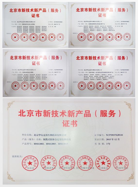 华安麦科自主研发生产的真菌毒素ELISA试剂盒、真菌毒素胶体金快速检测产品、真菌毒素免疫亲和柱、食品中激素、抗生素、违禁添加检测系列产品经北京市科委、市发展改革委、市经济信息化委、市住房城乡建设委、市质监局、中关村管委会组成新技术新产品(服务)认定小组联合审定,评选为2015年度第一批北京市新技术新产品(服务)。便携式胶体金定量检测系统被评为2015年度第二批北京市新技术新产品(服务)、br/> 北京市新技术新产品(服务)应具有技术先进性和创新性,并拥有自主知识产权,技术成熟、质量可靠,自认定之日起有效期为3年。华安麦科众多产品通过审核获证,是对我司产品较高创新性和技术先进性的认可,更是对我司自主创新能力的肯定,期待后期华安麦科可以给食品检测客户提供更好的产品,为食品安全事业多贡献一份力量、/span>