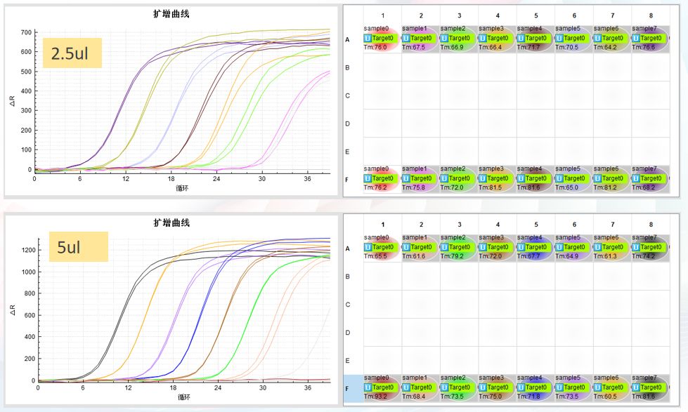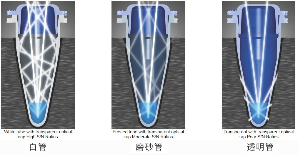 图1白管和透明管内部荧光信号路线图 然而,如图1所示,与其他管材相比,白管管壁不透明,几乎没有信号丢失,且隔绝了样品台污染的荧光信号干扰,减少了相同样本孔间差异。 优势二:白管支持最大限度的信号传输,改进对低拷贝数样本的检测,提高灵敏度。