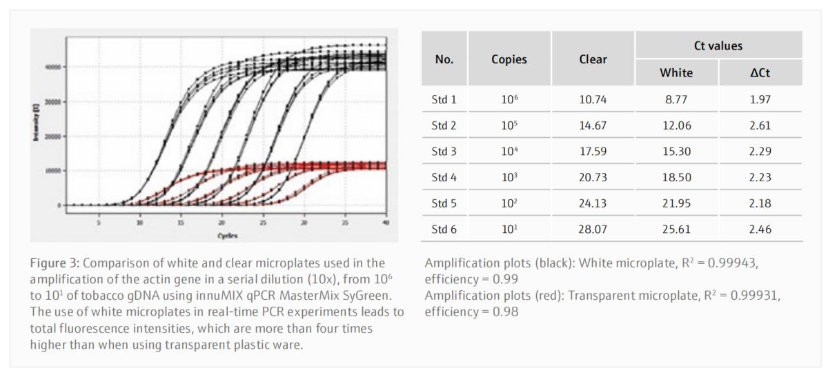 如上图,qPCR使用透明和白色耗材的结果比较: (A)与透明孔相比,白色孔Ct值更低(灵敏度更高)。 (B)白色孔在技术重复中也表现出更高的一致性。 在设置实时PCR或qPCR的反应时,与透明耗材相比,我们更推荐使用白色耗材,以实现灵敏和准确的荧光检测。 ——赛默飞生命科学 Jena