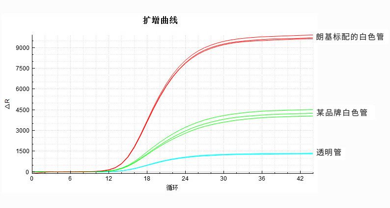 结果表明,相较于其他品牌白色管和透明管的扩增曲线,朗基标配的白色管的荧光信号值更强,曲线重合度更好。 综上所述, 在进行qPCR实验时, 使用白管和顶部检测技术的qPCR仪, 可获得更佳实验结果。 |