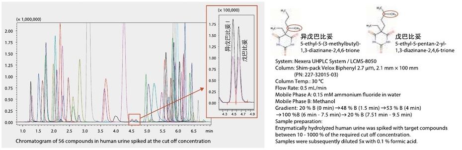 采用Shim-pack Velox Biphenyl 实心核颗粒色谱柱分析尿液?6种滥用药物及其代谢产物,分析时间10min,其中戊巴比妥和异戊巴比妥是一对同分异构体,在普通的反相C18色谱上比较难分离,而采用Shim-pack Velox Biphenyl色谱柱,能获得较好的基线分离、/span>