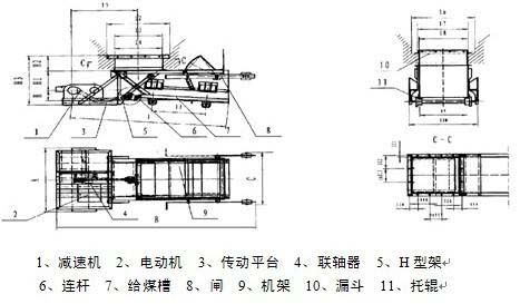 K型往复式给料机可以调节曲柄位置,从而调节底板行程而达到调节给料量,表中所列的给料能力是每种机型在该行程时并且调节闸门调到最大状态时的给料量、br/>主要外型尺寸