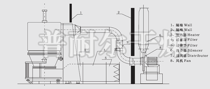 空气净化加热后,由引风机从下部导入,穿过料斗的网板,在工作室内,经搅拌和负压作用形成流态化,不断进行大面积的气固两相对流干燥,水份蒸发后随排气带走,达到物料干燥的目的、br/>安装示意图: