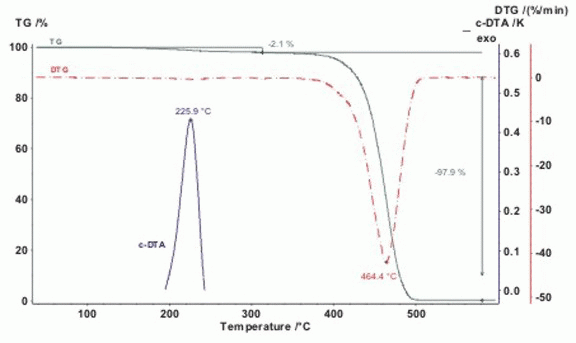 使用 TG 209 F3 c-DTA?功能,能够在热重测试的同时得到关于材料吸/放热效应的信息。上图为聚酰胺(PA)在氮气气氛下的两步分解,c-DTA?测得材料的熔融峰 226°C,从该温度判断样品可能为 PA6。熔融同时在热重曲线上已开始失重,这可能是由于添加剂的挥发所引起、/p>