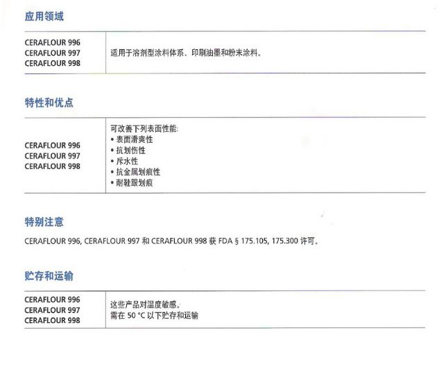 品牌9/strong> 毕克BYK 型号9/strong>CERAFLOUR-997 产品特性:提高表面爽滑性和抗划伤性,改善粉末涂料的耐沾污性、/p> 包装规格9/strong>20kg/匄/p> 应用9/strong>溶剂型涂料和粉末涂料 BYK-CERAFLOUR-997蜡粉是出众的一款微粉化蜡,基于PTFE改性PE(聚四氟乙烯改性聚乙烯)。用于溶剂型涂料体系和粉末涂料。提高表面爽滑性和抗划伤性,改善粉末涂料的耐沾污性,改善溶剂型涂料体系和粉末涂料和印刷油墨表面性能的微粉蜡、/p> Ceraflour 997用于各种涂料和溶剂型印刷油墨,如9/p>木器涂料:br/>卷筒胶印油墨:br/>单张纸油墨;