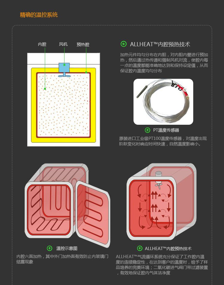 ALLHEATTM先进的内腔预热技术是将加热元件均匀地分布在内胆四周,对内腔内壁进行预加热,然后通过热传递和强制风机对流,使腔内每一点的温度都能准确地达到和保持在设定值,从而保证腔内温度均匀分布:/span>