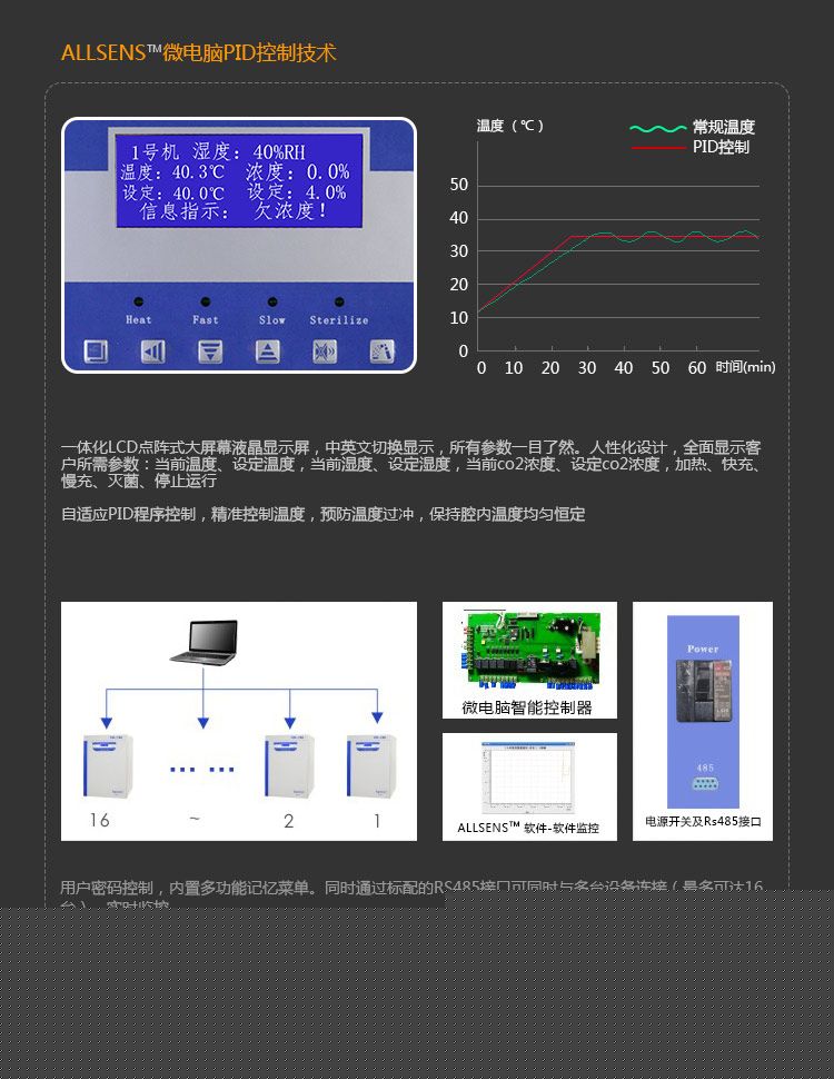 ALLSENSTM微电脑PID控制技术:一体化LCD点阵式大屏幕液晶显示屏,可选择中文或英文显示,所有参数显示一目了然、/span>