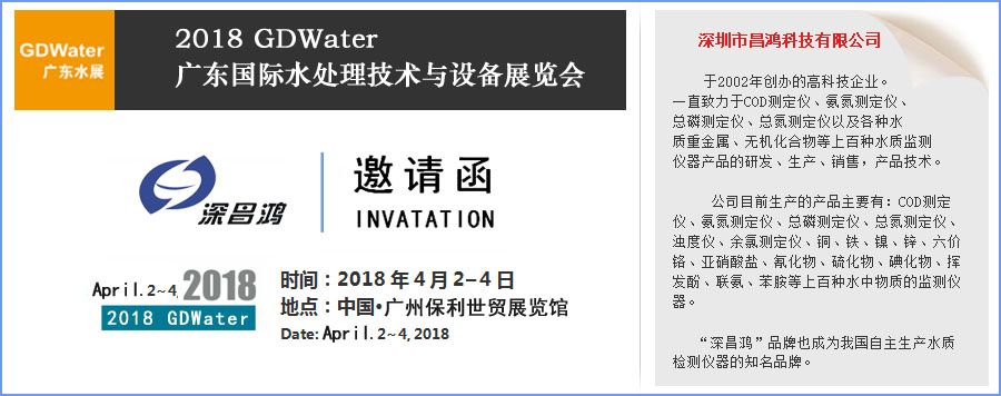本司将于2018??-4日,携自主研发生产水质检测仪器参加?018 GD Water广东国际水处理技术与设备展览会”。欢迎新老客户莅临参观指导、/span>