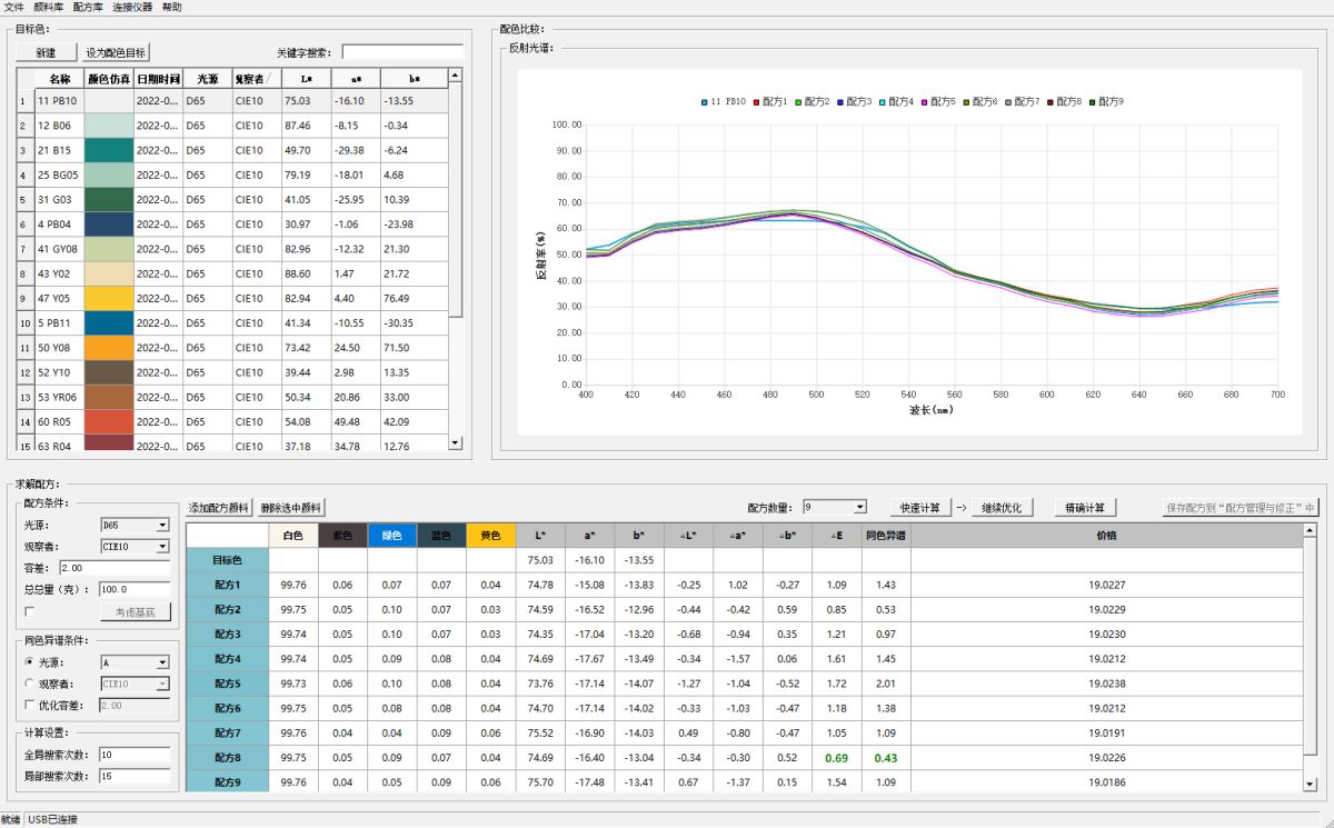 之后,由黄工对最新版本的FRU配色软件进行了说明讲解。包括设定目标色、选择颜料、添加配料配方、配色比较、求解配方等一些列基础操作都进行了多次演示。员工们对配色软件的功能进行了详细的提问,并列举了一些可以优化精进的地方。这之后黄工也提出了一些他对于公司仪器统一标准的一些想法,得到了不错的反响、/p>