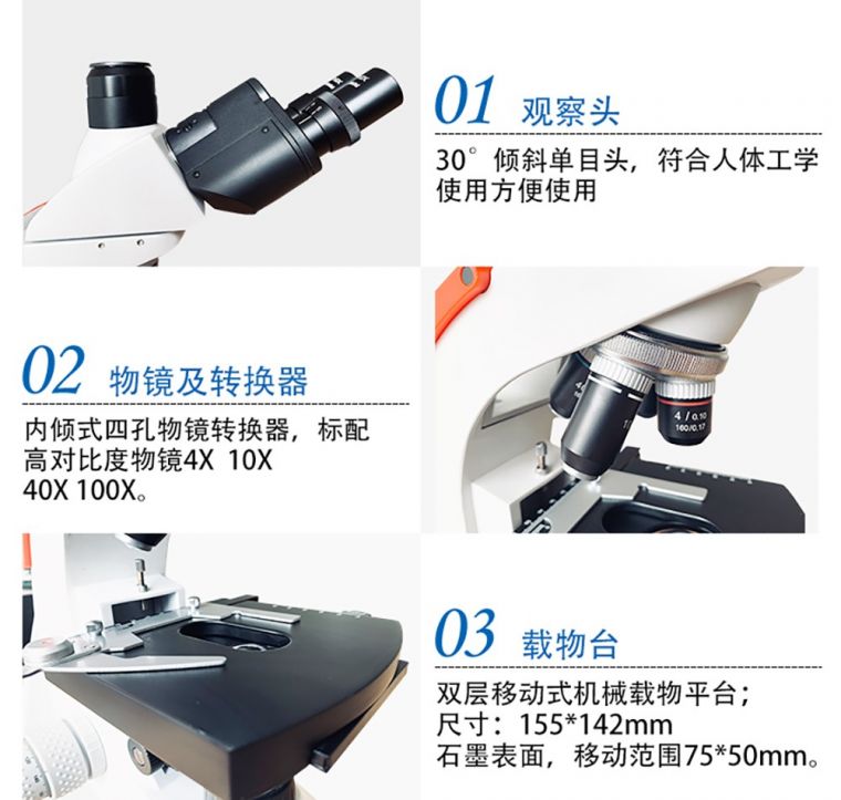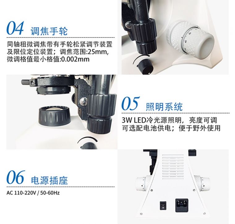 聚光镜:N.A.1.25阿贝聚光镜,精确限位设计齿轮齿条结构,确保更为准确的观察高度。高度可自行调节、/p>