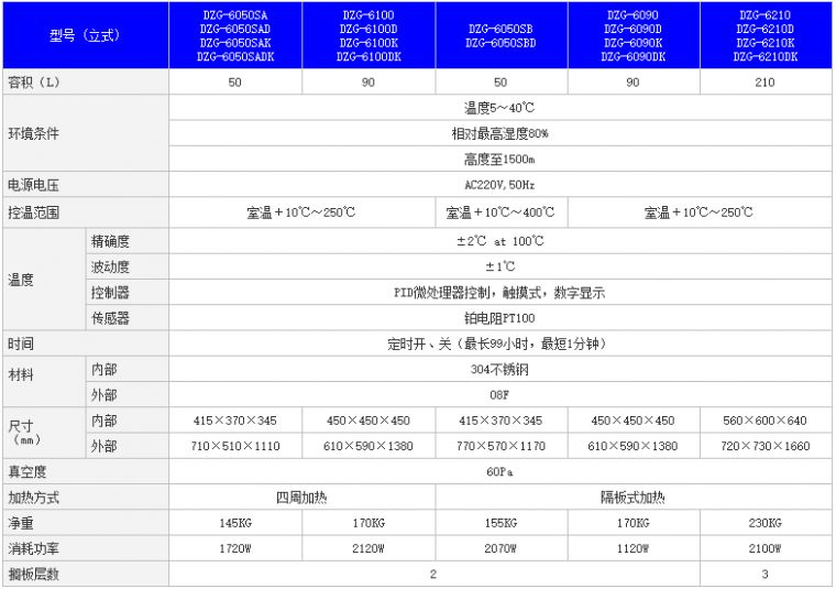 1. 长方形工作室,使有效容积达到更大、br /> 2. 不锈钢工作室,优质钢板静电喷塑外壳,?050SB(D)无观察窗外,其它为钢化、防弹双层玻璃观察窗,使用安全,方便,造型新颖,美观、br /> 3. 箱门闭合松紧能调节,整体成型的硅橡胶门封圈,确保箱内高真空度、br /> 4. 立式真空干燥箱内置轻触互锁式电磁阀、真空泵,真空抽压,泄压使用方便、br /> 5. 控温仪采用高速、高性能CPU处理芯片,高灵敏、高精度铂电阻传感器,具有定时开机、定时关闭、定值工作的固定编程控制功能;定时时间长?9小时、br /> 6. 控温仪自带传感器故障报警、上下限温度偏差报警、超温报警、参数记忆;温度显示校正,自诊断动态控制技术、br /> 7. 带防真空泵油回流装置、br /> 8. D型为智能型十段可编程控制,实现温度的曲线编程运行、br /> 9. K型为数字式真空表,可根据要求设定最高和最低真空度值,自动循环,实现真空度数量的控制、br /> 10. 独立限温控制报警系统,超过限定温度自动中断工作,双重保险。(选配:仅加热方式为“四周加热”的型号(br /> 11. 加装惰性气体端口和惰性气体流量表。(选配(br /> 12. 可实现仪器的远程控制:无线通讯报警系统。(选配(br />技术参 (Specification(/strong>