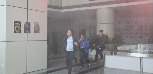 员工们捂住口鼻,有序地从紧急出口向外撤禺/p>