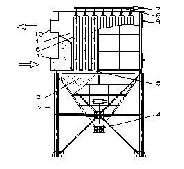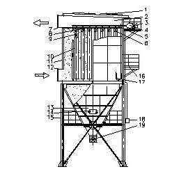 | 脉冲袋式除尘器示意图 1-上盖?nbsp; 2-上箱?nbsp; 3-脉冲阀 4-气包 5-喷吹箠br/>6-文氏?nbsp; 7-出气?nbsp; 8-花板 9-袋笼 10-滤袋 11-中箱?nbsp; 12-进气?nbsp; 13-灰斗 14-检查门 15-支架 16-平台 17-压力?nbsp; 18-脉冲控制阀 19-排灰阀 |