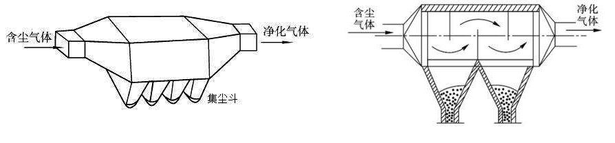 重力沉降室的结构一般分为水平气流沉降室和垂直其流沉降室。水平气流沉降室在实际运行时,都要在室内加设备各种挡尘板,以提高除尘效率。沉降室也可用喷嘴喷水来提高除尘效率、/span>