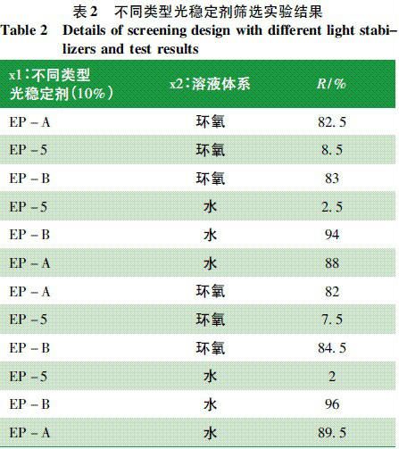 2) 以水性环氧涂料为溶剂混合不同类型光稳定剂称取10g不同类型光稳定剂见表1,加?00g水性环氧涂料中,混合搅?min,再将溶液倒入?#滤纸的水流抽器机抽滤后,?0℃烘干后称质量,计算其在滤纸上的残留率R、/span>