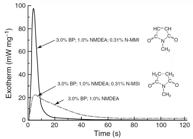 为了表征一下N-取代马来酰亚胺的特殊贡献,首先进行了一个简单的实验来对比N-甲基琥珀酰亚?N-MSI)和N-甲基马来酰亚?N-MMI)对光固化聚合反应的影响。实验采用的配方是添加了3.0%二苯甲酮?.0% NMDEA的HDDA。对比实验结果如?、/span>