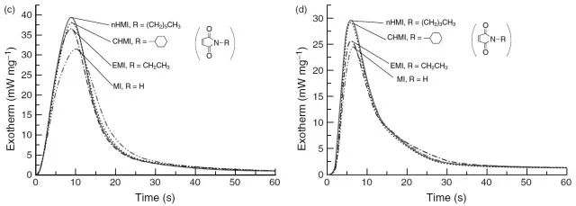 ? N-烷基取代对于包含0.1% MIs?.0% BP?.0% NMDEA的HDDA混合物光聚合的放热曲线影响?40℃,通氮??a)中压汞灯,带?5%中性滤光器(I0= 8.8?.2Mw/cm2)?b)313nm滤光?I0= 0.39Mw/cm2)?c)365nm滤光?I0= 0.41Mw/cm2)?d) 汞灯中性光(I0= 27.9?9.5Mw/cm2,空气中)