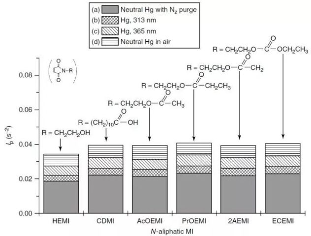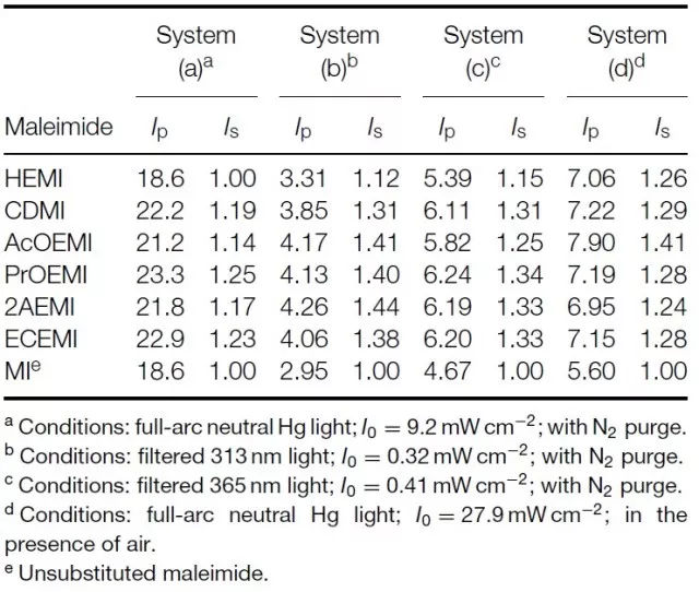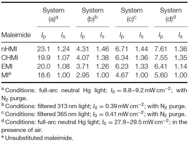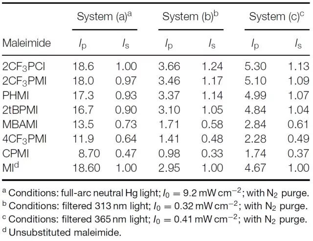 从图2和表4的对比数据可以看出,N-烷基取代的马来酰亚胺和非取代马来酰亚胺相比对于Ip的影响不算很大,但是有明显的差别。而且这种影响的趋势和反应环境中的辐照类型(UV波长)及辐照强度关系不大、/span>