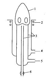1-等离子体炬焰?-高频线圈?-三个同心石英管;4-辅助氩气?-冷却氩气(冷却中心炬管)?-工作氩气及样品入?由雾化室进入)