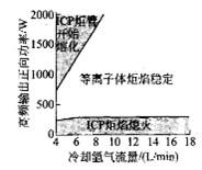 等离子体输入的正向功率,一般为1 kW,消耗能量包括工作气流和冷却气流带走的能量、热辐射和光辐射散失的能量,试样和溶剂蒸发、气化和激发消耗的能量,炬管壁传导和热辐射能量。当这些消耗能量的总和大于高频输入的正向功率时,会使等离子体炬焰熄灭,而高频输入的正向功率过大又会烧毁等离子体炬管,对每一支ICP石英炬管都有保持ICP炬焰稳定的曲线,对直?2 mm的ICP炬管的等离子体炬焰的稳定曲线如图4所示、/p>