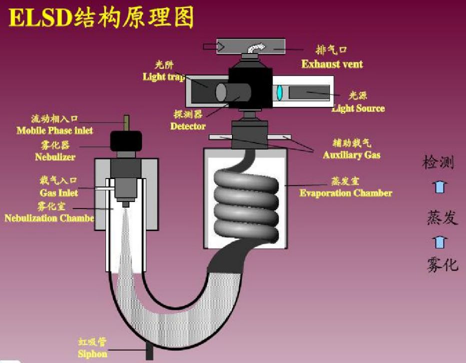 蒸发光散射检测器的独特检测原理为,首先将柱洗脱液雾化形成气溶胶,然后在加热的漂移管中将溶剂蒸发,最后余下的不挥发性溶质颗粒在光散射检测池中得到检测、/p>