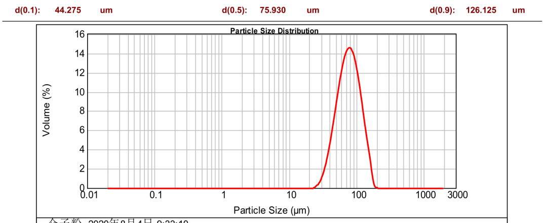 这两种仪器给出的D50值分别为75.76μm?5.93μm,相对误?.2%;D90值分别为127.02 μm?26.13 μm,相对误?.7%;D10值分别为41.51μm?4.28μm,相对误?.5%。可见这两个结果的吻合度相当好、/span>