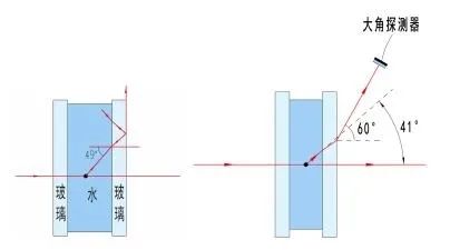 虽然突破了傅里叶透镜孔径的限制,它的测量角的上限还要受光线全反射规律的限制。假设颗粒处在水中,散射光从水中传播到玻璃再到空气,经过了两次折射。由于空气的折射率低于水的折射率,由光的折射定律可以知道,光线在空气中的出射角总是大于水中的入射角。当照明光垂直入射到测量池时,水中散射光的散射角等于散射光对玻璃的入射角。当水中的散射角约为49°时,空气中的出射角等?0°,如?(a)所示。散射角再增大时,散射光将被玻璃/空气界面完全反射,不能出射到空气中。这种现象称为“光的全反射”,而此时的入射角称为“全反射的临界角”。实际的激光粒度仪不可能把探测单元放置?0°的位置。例如某国外仪器空气中的最大角探测器位置为60°(见图6(b)),对应于水中的散射角?1°。所以该仪器能接收的最大前向散射角?1°。在后向上也放置了最?0°的探测器,故后向只能接收139°(=180° -41°)以上 散射光。这样,这种光学系统就存?1°?39°的测量盲区,盲区跨度?8°,见?(a)、/span>