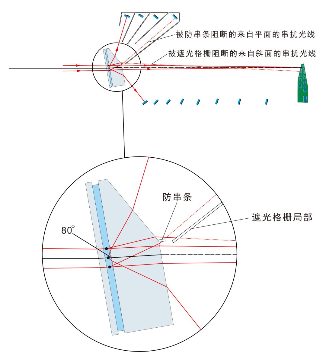 真理光学提出了一种斜置的梯形窗口方案,见?。在该方案中,窗口玻璃倾斜10°放置,可把散射光的临界角扩展7°左右,同时前向玻璃加厚,把玻?空气界面的一部分做成30°的斜面,使原本在玻璃/空气界面上接近或大于临界角的散射光的入射角小于临界角。这种结构能让可接收的最大散射角(在水中看)扩展?0°,后向的最小散射角则减?5°,测量盲区为80°?35°,盲区跨度共55°,见?(b)、/span>